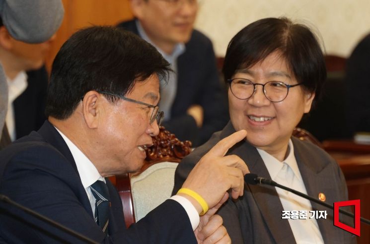 최교진 교육부장관(왼쪽)과 정은경 보건복지부 장관이 1일 서울 종로구 정부서울청사에서 열린 제2차 국토대전환 범정부 추진협의회에 참석해 대화하고 있다.