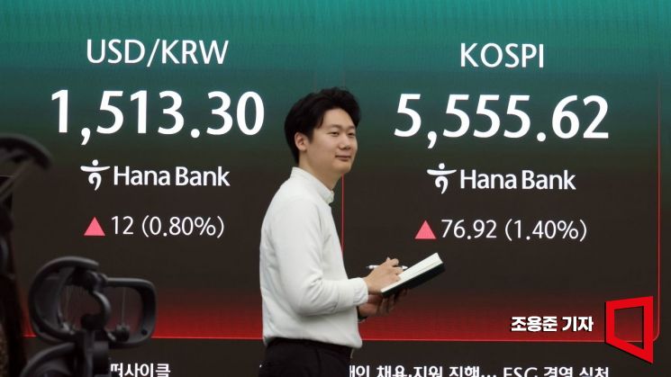 도널드 트럼프 미국 대통령이 미국-이란 전쟁의 ‘2~3주 내 종료 방침을 밝힌 가운데 이란 전쟁과 관련한 대국민 연설을 예고한 2일 서울 중구 하나은행 본점 딜링룸에서 직원이 증시와 환율, 코스닥 등을 모니터하고 있다. 이날 코스피는 전 거래일 대비 1.33% 오른 5551.59에 코스닥은 1.25% 상승으로 출발했다.