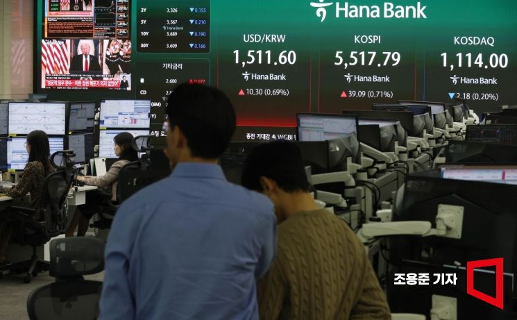 2일 미국-이란 전쟁이 곧 끝날거라는 기대감에 국내 증시가 연이틀 상승 출발했지만 도널드 트럼프 미국 대통령의 대국민연설 후 2% 이상 하락하고 있다. 서울 중구 하나은행 본점 딜링룸에 트럼프 대통령의 연설 영상이 생중계 되고 있다.