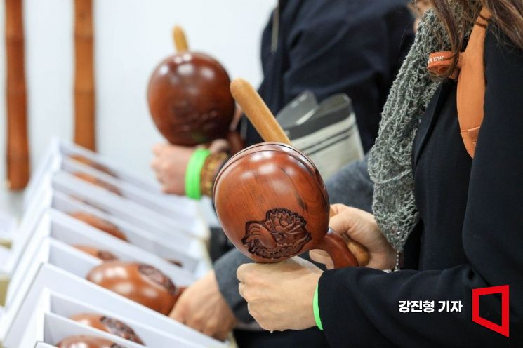 2일 서울 강남구 코엑스에서 열린 '2026 서울국제불교박람회'를 찾은 관람객들이 목탁을 두드리고 있다.