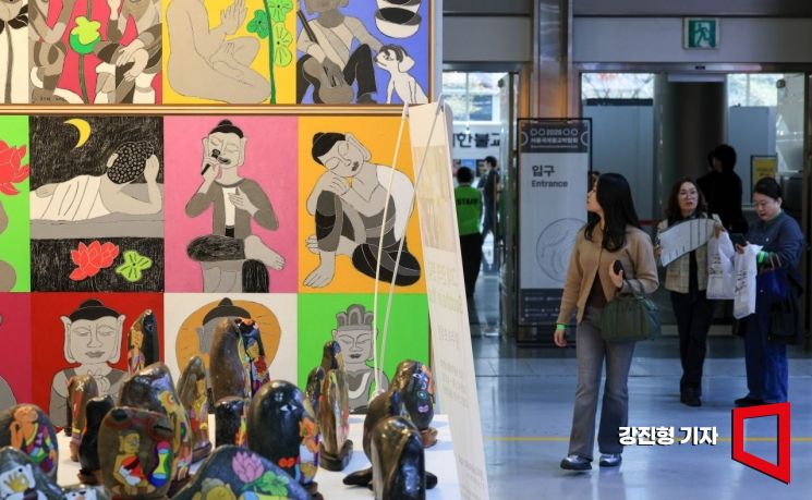 2일 서울 강남구 코엑스에서 열린 '2026 서울국제불교박람회'를 찾은 관람객들이 예술작품을 보고 있다.