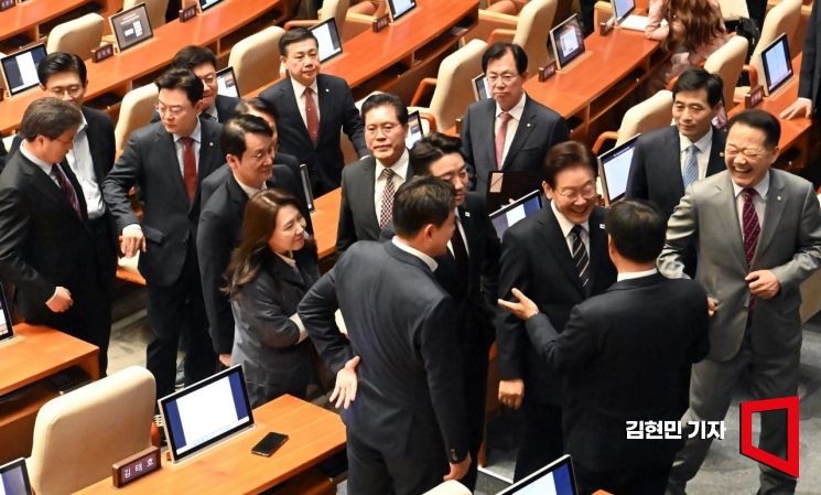 이재명 대통령이 2일 국회에서 열린 추가경정예산안과 관련한 시정연설을 마친 뒤 퇴장하며 국민의힘 의원들과 인사하고 있다.