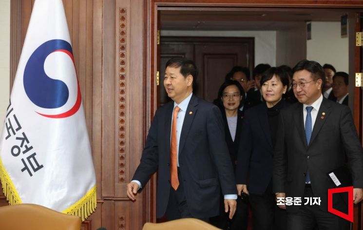 구윤철 경제부총리 겸 재정경제부 장관을 비롯한 국무위원들이 3일 서울 종로구 정부서울청사에서 열린 비상경제본부회의 겸 경제관계장관회의에 참석하고 있다.