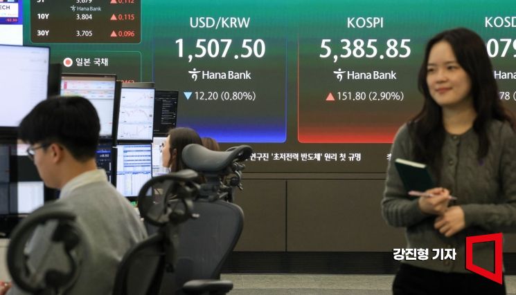 코스피 지수가 호르무즈 통항 기대감에 장 초반 3%대 반등한 3일 서울 중구 하나은행 본점 딜링룸 전광판에 국내증시 지수가 표시돼 있다.