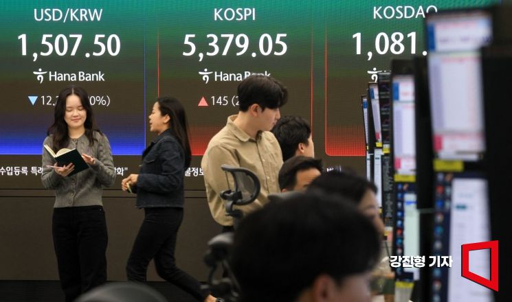 코스피 지수가 호르무즈 통항 기대감에 장 초반 3%대 반등한 3일 서울 중구 하나은행 본점 딜링룸 전광판에 국내증시 지수가 표시돼 있다.