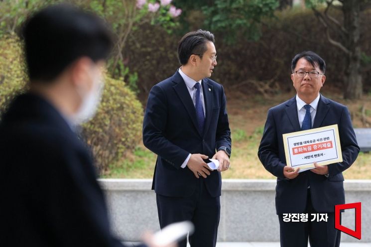 전용기 더불어민주당 의원(오른쪽 두 번째)과 이화영 전 경기도 평화부지사의 변호를 맡았던 서민석 변호사가 6일 서울 서초구 서울고등검찰청에서 쌍방울 대북송금 사건 관련 통화녹음 증거제출을 하기 위해 이동하고 있다.