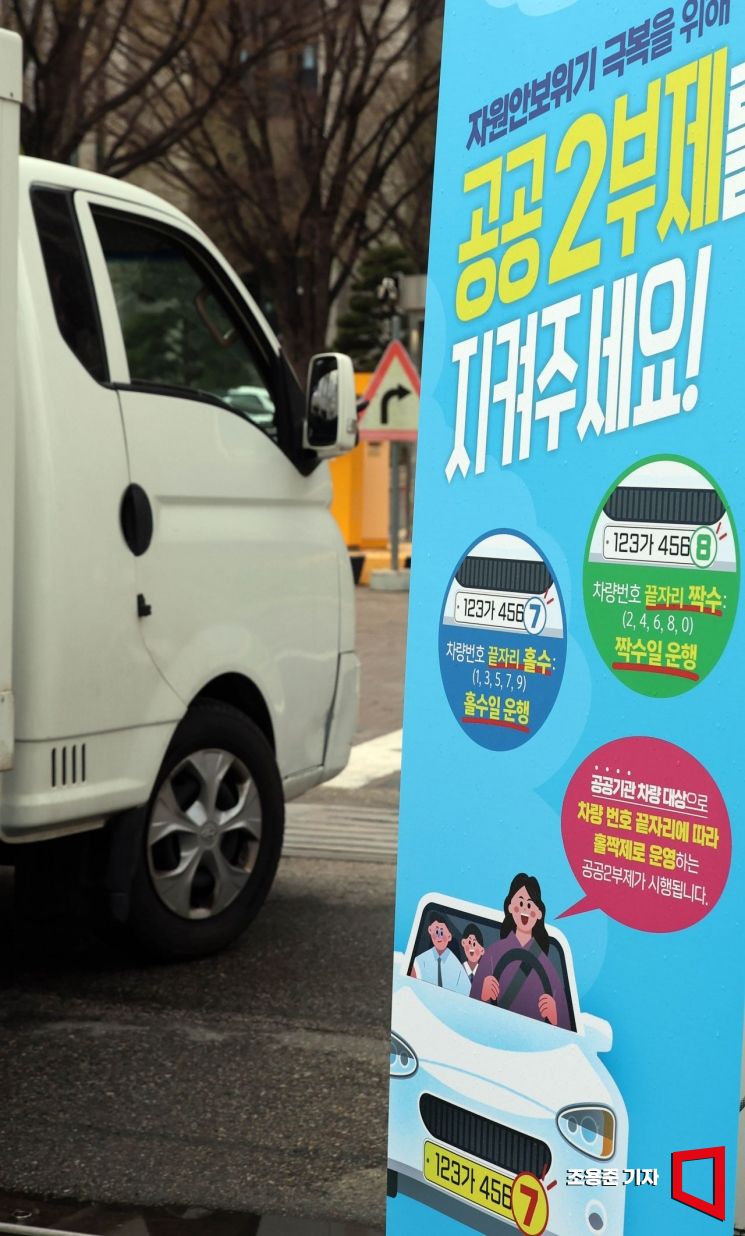 미-이란 전쟁 장기화에 따른 국제 유가 상승 등 에너지 수급 불안에 대응하기 위해 오는 8일부터 공공기관 '2부제'를 비롯해 공영주차장도 '5부제'를 시행한다. 6일 서울 종로구 정부서울청사 출입문에 2부제 관련 안내문이 붙어 있다.