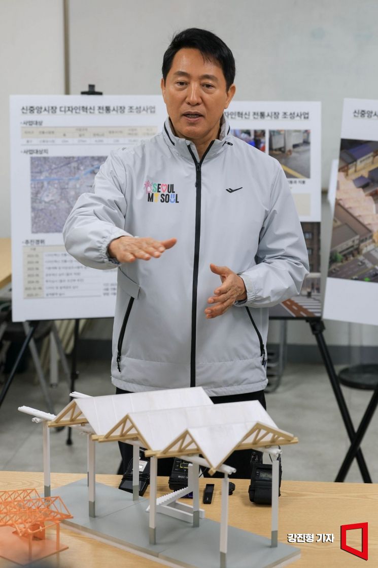 오세훈 서울시장이 8일 서울 중구 서울중앙시장을 방문해 디자인혁신 전통시장 조성사업에 대한 설명을 청취한 뒤 발언 하고 있다.