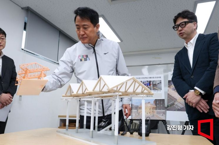 오세훈 서울시장이 8일 서울 중구 서울중앙시장을 방문해 디자인혁신 전통시장 조성사업에 대한 설명을 청취한 뒤 리모델링 모형을 보고 있다.