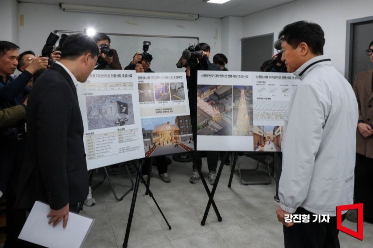 오세훈 서울시장이 8일 서울 중구 서울중앙시장을 방문해 디자인혁신 전통시장 조성사업에 대해 설명 듣고 있다.