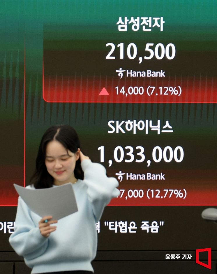 미국·이스라엘과 이란 간 휴전 합의 소식에 코스피 지수가 7% 가까이 급등하며 장을 마감한 8일 서울 중구 하나은행 딜링룸 지수 현황판에 각종 지수가 표시되고 있다. 이날 삼성전자는 7.12% 급등하며 지난 20일 이후 13거래일 만에 20만원선을 돌파했고, SK하이닉스도 12.277% 뛰며 100만원선을 회복했다.