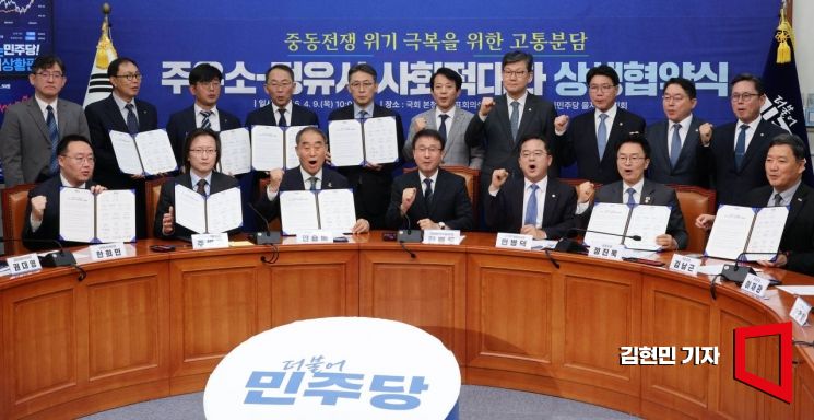 한병도 더불어민주당 원내대표가 9일 국회에서 열린 주유소-정유사 사회적대화 상생협약식에서 참석자들고 파이팅을 외치고 있다.