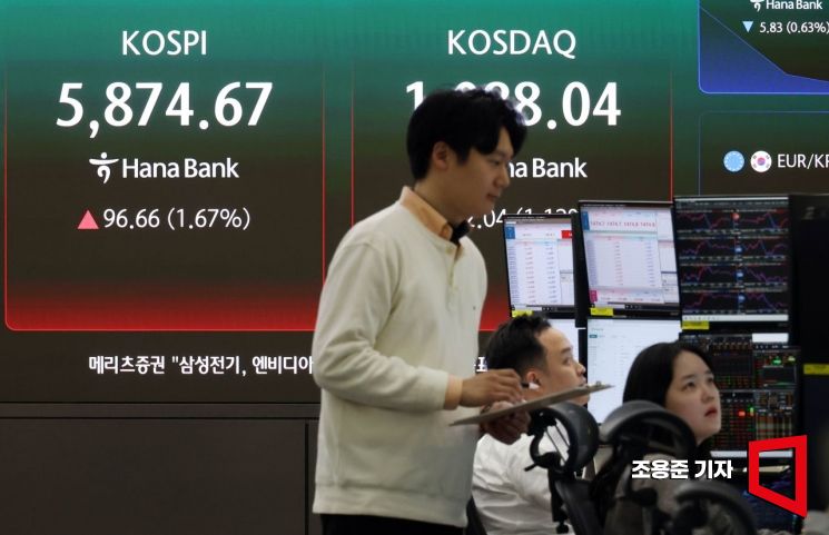 미-이란 전쟁이 2주간 휴전에 들어간 가운데 국내증시가 2% 가까이 상승 출발한 10일 서울 중구 하나은행 본점 딜링룸에서 직원이 증시와 환율 등을 모니터하고 있다. 이날 코스피는 전 거래일 대비 98.11p(1.70%) 오른 5876.12에 코스닥은13.14p(1.22%) 오른 1089.14, 원/달러 환율은 7.4원 내린 1475.1원에 장을 시작했다.