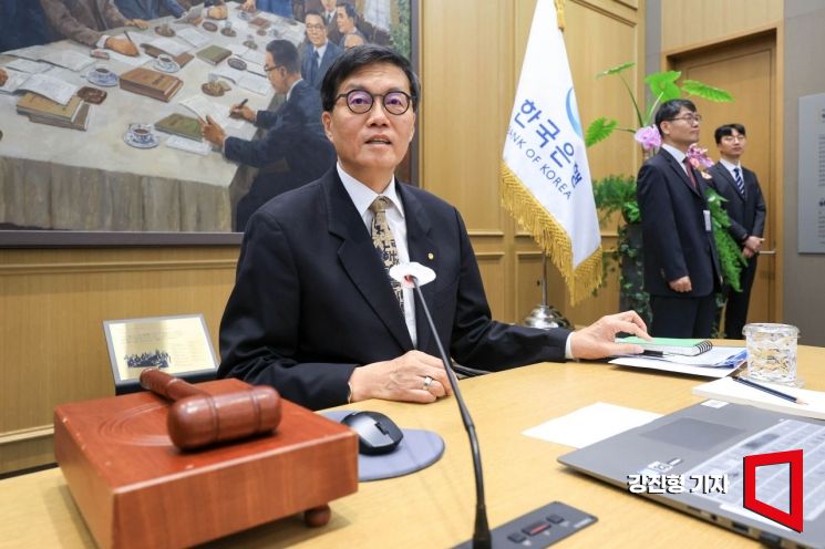 이창용 한국은행 총재가 10일 서울 중구 한국은행 본관에서 열린 금융통화위원회 본회의에서 회의를 주재 하고 있다.