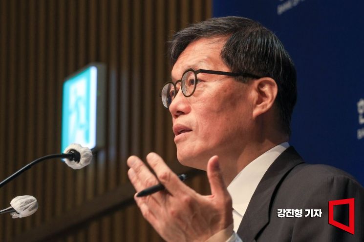 이창용 한국은행 총재가 10일 서울 중구 한국은행에서 열린 통화정책방향 기자간담회에서 취재진 질문에 답하고 있다.