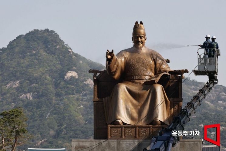 13일 서울 종로구 광화문광장에서 서울시 관계자들이 세종대왕 동상을 세척하고 있다. 서울시는 광화문광장 세종대왕과 이순신 장군 동상의 원형을 보존하기 위해 정기적으로 보수와 세척 작업을 하고 있다.