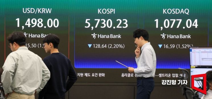 미국과 이란의 종전 협상이 결렬된 가운데 코스피 지수가 장 초반 2.08% 하락 출발한 13일 서울 중구 하나은행 딜링룸 전광판에 국내증시 현황이 표시돼 있다. 이날 원달러 환율은 전 거래일보다 12.9원 상승한 1495.4원에 거래를 시작 했다.