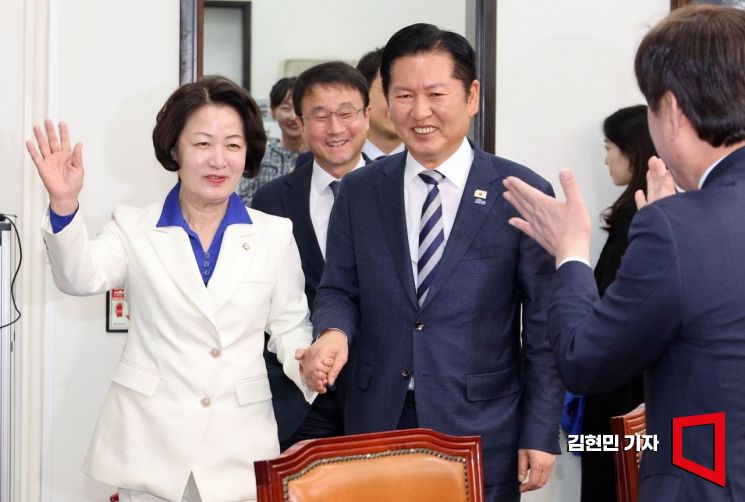 정청래 더불어민주당 대표가 13일 국회에서 열린 경기도지사 후보 환영식에서 추미애 후보와 손을 잡은 채 입장하고 있다.