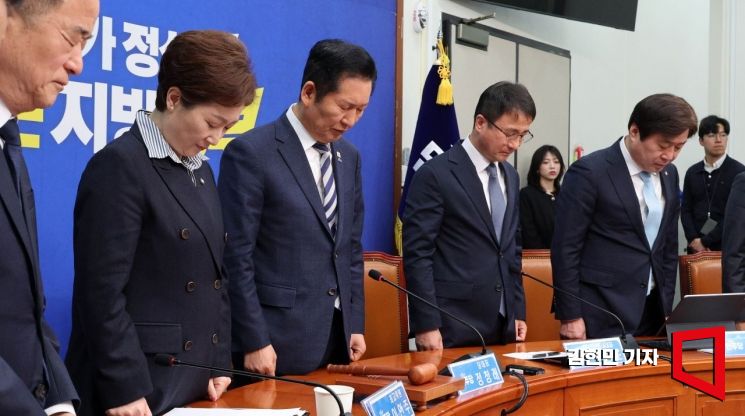 정청래 더불어민주당 대표를 비롯한 최고위원들이 13일 국회에서 열린 최고위원회의에 앞서 완도 화재 순직 소방관을 추모하고 있다.