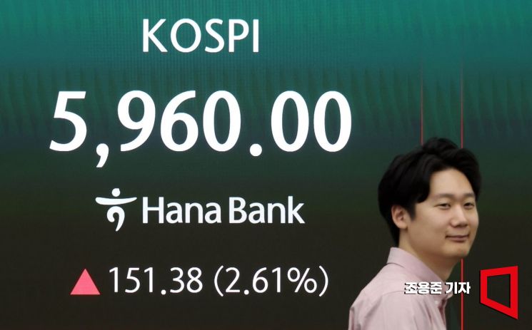 미국과 이란의 협상 재개 기대감에 국내증시가 2% 이상 상승 출발한 14일 서울 중구 하나은행 본점 딜링룸에서 직원이 증시와 환율 등을 모니터하고 있다. 이날 코스피는 전 거래일 대비 151.38p(2.61%) 오른 5960.00에 코스닥은20.77p(1.89%) 오른 1120.61에 장을 시작했다.