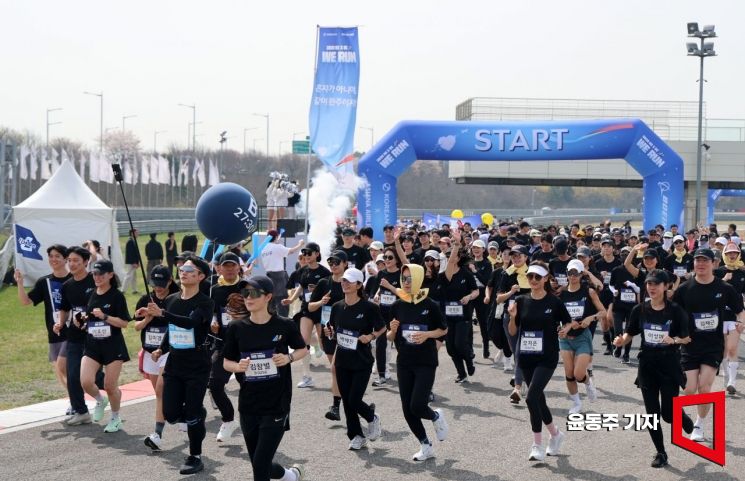대한항공-아시아나항공 객실승무원 화합 기부 러닝 행사가 14일 인천 영종도 BMW 드라이빙 센터에서 열렸다. 행사에 참석한 양사 직원들이 화합을 도모하며 힘차게 출발하고 있다.