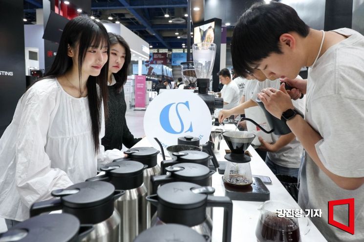 15일 서울 강남구 코엑스에서 열린 '2026 서울커피엑스포'에 참가한 관람객이 핸드드립커피 제조 과정을 보고 있다.