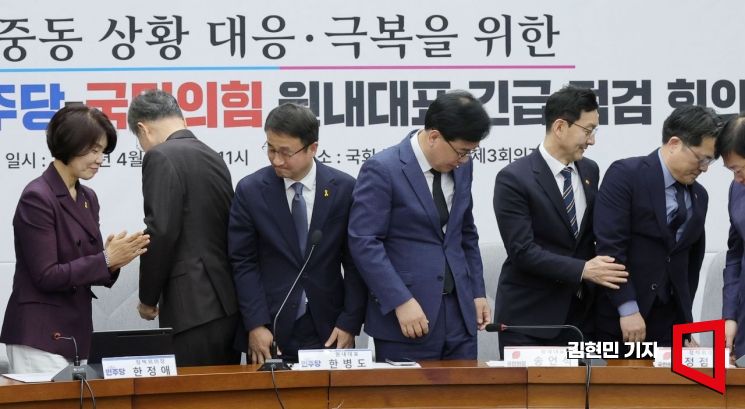 한병도 더불어민주당 원내대표와 송언석 국민의힘 원내대표를 비롯한 참석자들이 16일 서울 여의도 국회에서 열린 '중동 상황 대응·극복을 위한 더불어민주당·국민의힘 원내대표 긴급 점검 회의'에서 기념촬영을 미친 뒤 자리로 향하고 있다.