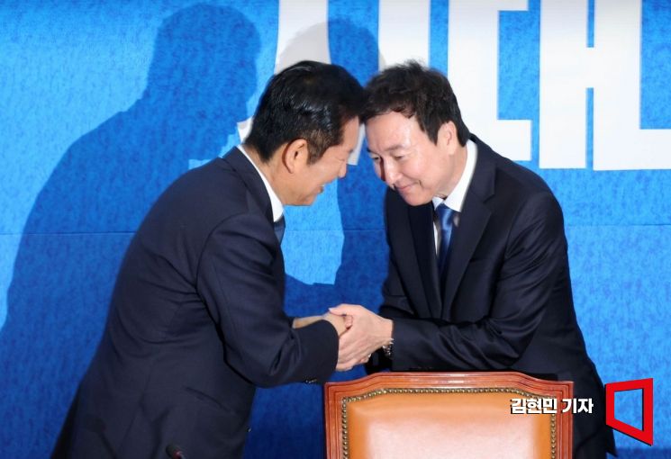 정청래 더불어민주당 대표와 전태진 변호사가 17일 국회에서 열린 1차 인재영입식에서 손을 맞잡고 있다. 전 변호사는 당 울산시장 예비후보로 출마하는 김상욱 의원의 지역구인 울산 남갑에 전략 공천될 예정이다.