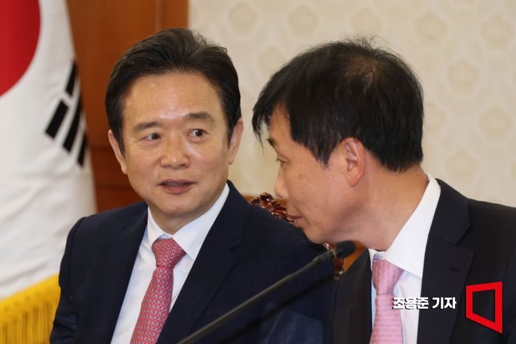 남경필 (사)은구대표(왼쪽)가 17일 서울 종로구 정부서울청사에서 열린 마약류 대응 관계장관회의에 참석해 대화를 나누고 있다.