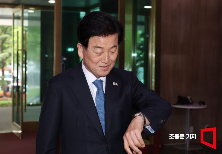 정동영 통일부 장관이 20일 서울 종로구 정부서울청사로 들어서며 최근 북한 구성시 핵시설 위치 발언과 관련해 기자들의 질의에 답하기 앞서 시계를 보고 있다.