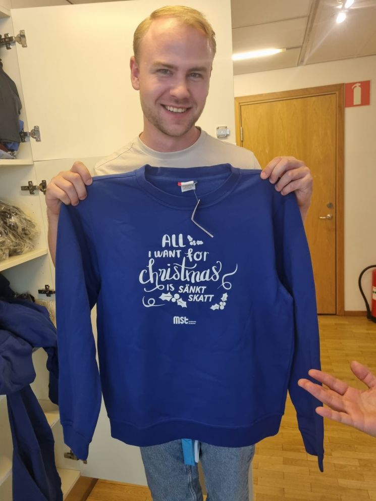 사진=더글라스 토르 온건당 청년정치연합(MUF, Moderate Youth League) 의장이 작년 크리스마스 때 청년 당원을 모집하면서 홍보 차 사용했던 소품들을 선보이고 있다.