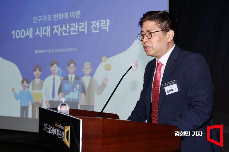 김진웅 NH투자증권 100세시대연구소장이 19일 서울 중구 은행회관에서 열린 '2023 아시아경제 골드에이지포럼'에서 '인구구조 변화에 따른 100세 시대 자산관리 전략'을 주제로 강연하고 있다. 사진=김현민 기자 kimhyun81@