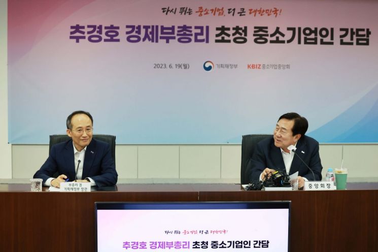 김기문 중소기업중앙회장이 지난달 19일 서울 영등포구 중소기업중앙회에서 열린 추경호 경제부총리 겸 기획재정부 장관과 중소기업인의 간담회에 참석해 발언하고 있다. [사진제공=연합뉴스]