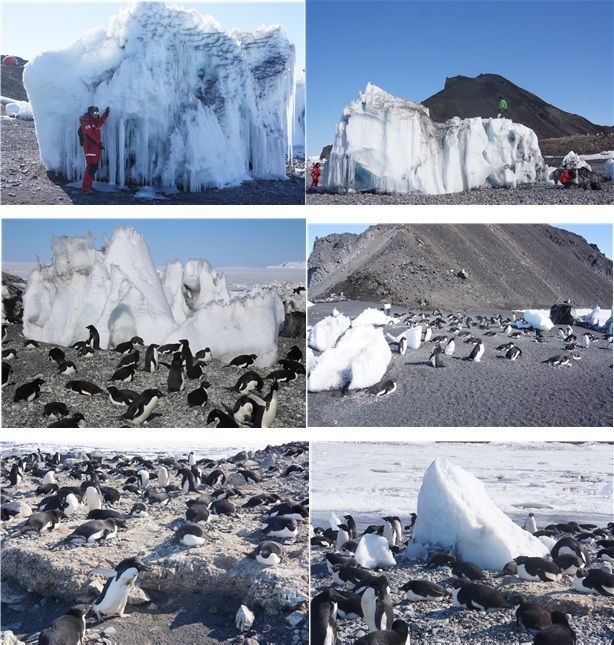 2019년 12월 번식지 전경. 2019년 2월에 발생한 해일이 다양한 크기의 빙산들을 에드몬슨 포인트의 해안 깊숙한 곳까지 옮겨놓았으며, 이 빙산들이 다음 번식기인 12월까지 해안과 펭귄 서식지에 녹지 않고 남음. 극지연 제공