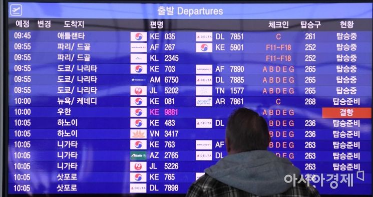 As the charter flight schedule for transporting Korean residents living in Wuhan, China has been delayed, a cancellation notice for the Wuhan-bound flight is displayed on the departure board at Terminal 2 of Incheon International Airport on the 30th./Yeongjongdo=Reporter Kim Hyun-min kimhyun81@