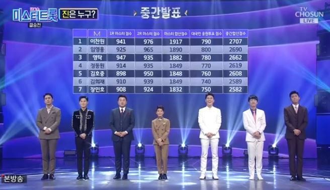 The episode of 'Mr. Trot' aired on the night of the 12th featured the final performances of Jang Min-ho, Kim Hee-jae, Kim Ho-joong, Jeong Dong-won, Young Tak, Lee Chan-won, and Lim Young-woong. To prevent the spread of the novel coronavirus (COVID-19), the finals were pre-recorded without an audience, but the voting results determining the final 'Jin, Seon, Mi' were broadcast live.
