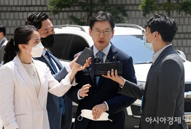Kim Kyung-soo, Governor of Gyeongnam Province, who was sentenced to prison in the first trial for conspiring to manipulate comments on a portal site and was released on bail, is answering reporters' questions before attending the continuation of the appeal trial at the Seoul High Court in Seocho-gu, Seoul on the 22nd./Reporter Kim Hyun-min kimhyun81@