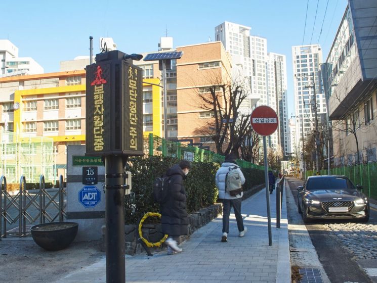 On December 11, Seocho-gu installed the smart motion sensor alarm at the crosswalk in front of the back gate of Sindong Elementary School.