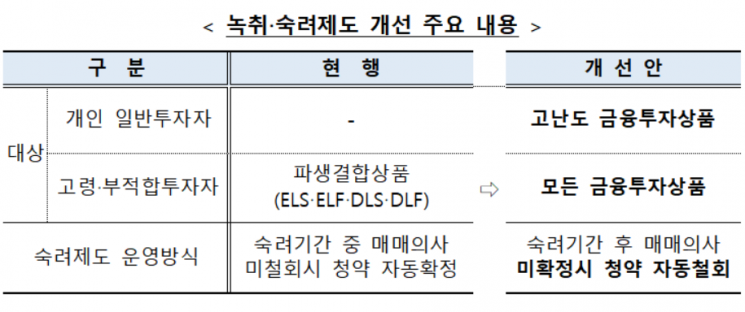 The amendment also includes provisions to classify derivative-linked securities, derivatives, and funds with a maximum principal loss exceeding 20% as "high-difficulty financial products." Discretionary investment trusts and money trusts with a loss risk exceeding 20% of the principal and complex management methods are defined as "high-difficulty discretionary investment contracts" and "high-difficulty money trust contracts," respectively. For high-difficulty financial investment products, regardless of age or investment suitability, the sales process must be recorded, and a cooling-off period of at least two days is granted to allow investors to reconsider and withdraw their subscription. The recording and cooling-off system, currently applied only to derivative-linked products for elderly and unsuitable investors, will be expanded to all financial products. The current age criterion for elderly investors, set at 70 years or older, will be lowered to 65 years.