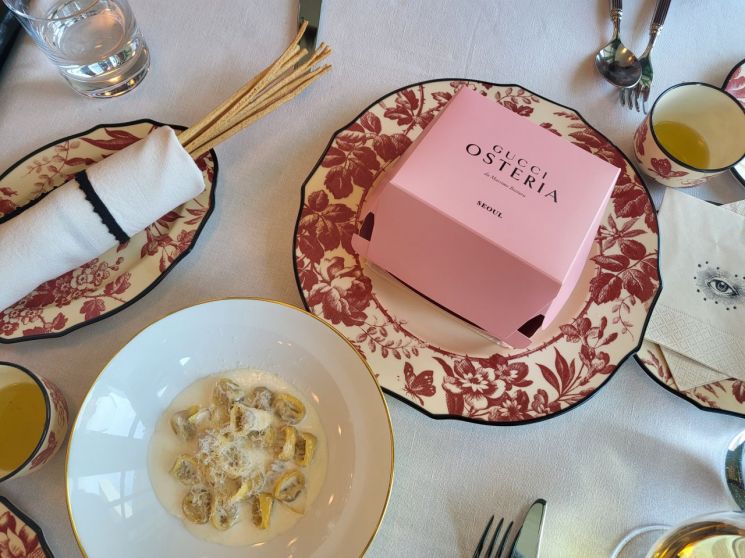 [Asia Economy Reporter Jeon Jinyoung] "The plates are so beautiful. Are they all Gucci?" The Italian luxury brand Gucci has opened a restaurant where you can taste Gucci. The fact that you can enjoy luxury with your mouth has kept customers coming even in the early days of its opening. On the 28th, Gucci opened its fourth restaurant worldwide, 'Gucci Osteria Seoul,' in Itaewon, Seoul.
