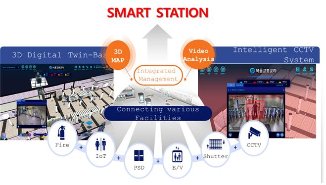 The Smart Station system is built on an integrated platform that can quickly and efficiently collect and analyze data gathered from various station facilities. 3D maps, IoT sensors, and intelligent CCTV are organically linked, enabling integrated station management in areas such as security, disaster response, facilities, and customer service through a single system.