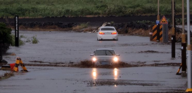 On the 4th, a vehicle passes along the coastal road of Songaksan, Jeju Island, which was flooded by Typhoon Hinnamnor. [Image source=Yonhap News]