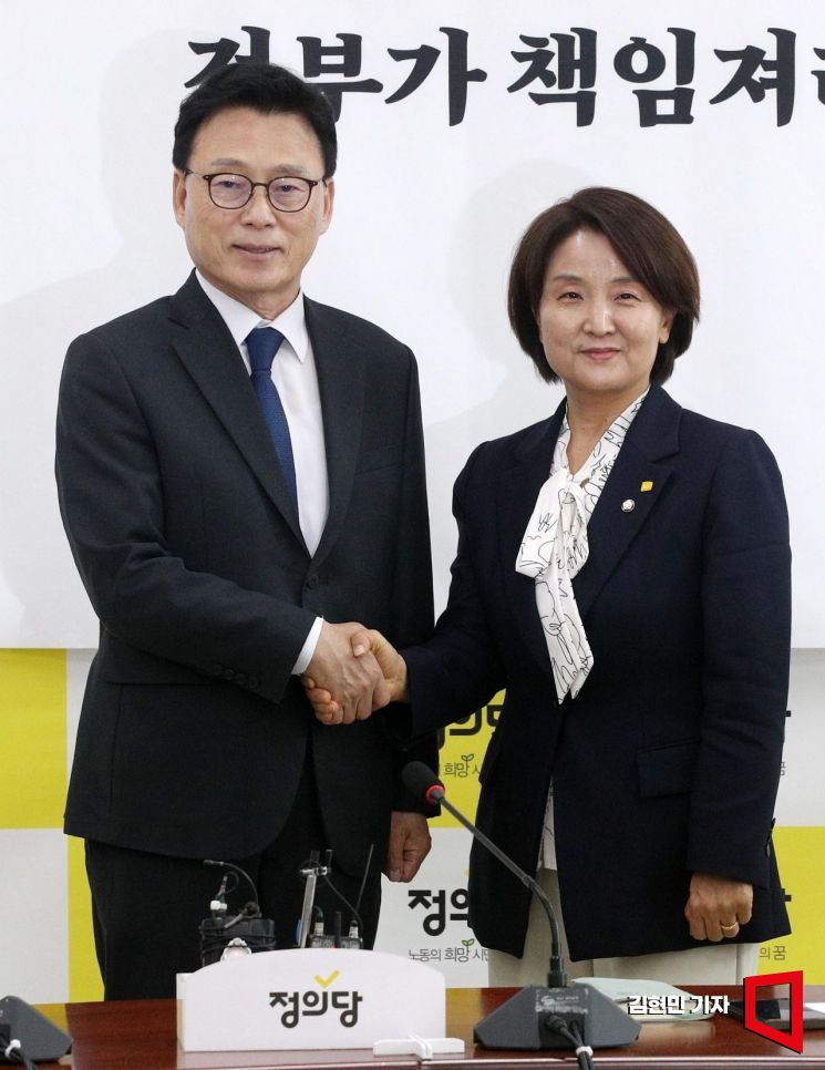 On the 2nd, Park Kwang-on, the floor leader of the Democratic Party of Korea, visited Lee Eun-ju, the floor leader of the Justice Party, at the National Assembly and took a commemorative photo. Photo by Kim Hyun-min kimhyun81@