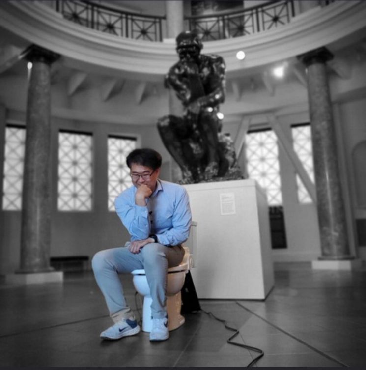 Dr. Seungmin Park of Stanford University School of Medicine in the United States is posing in a similar posture in front of Rodin's "The Thinker" sculpture on campus, with a toilet placed in front of it. [Image source=Screenshot from Dr. Seungmin Park's SNS]