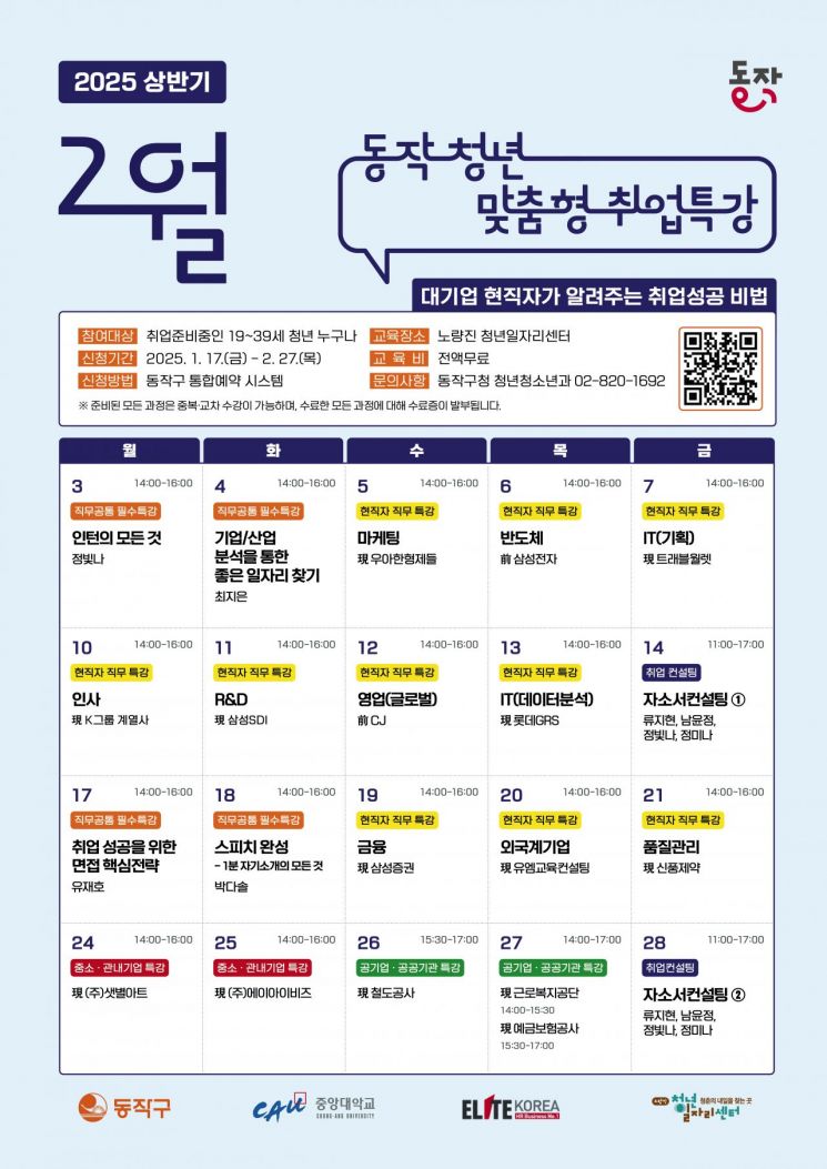 Any youth aged 19 to 39 residing or active in Dongjak-gu can participate, and applications can be made through the Dongjak-gu Office integrated reservation system on the website or via the QR code on the poster by the day before each lecture.