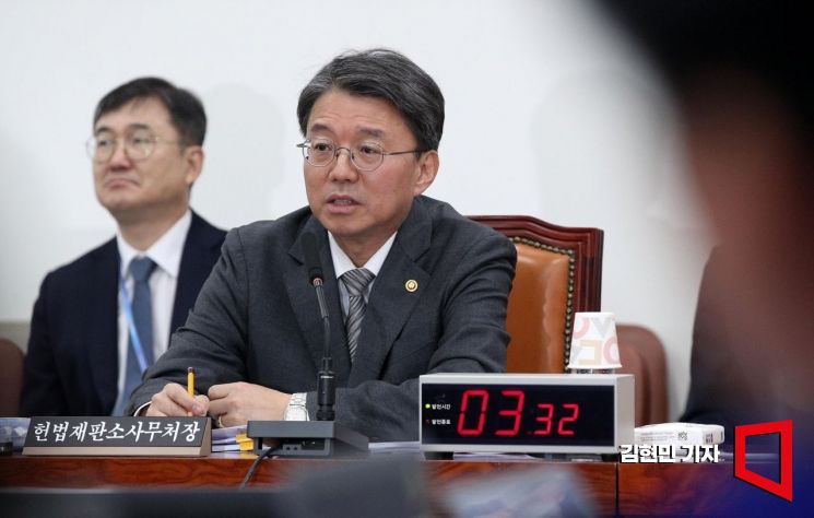 Kim Jeong-won, Secretary General of the Constitutional Court, is speaking at the full meeting of the Legislation and Judiciary Committee held at the National Assembly on the 31st.