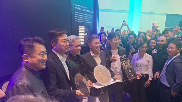 NVIDIA CEO Jensen Huang is taking a commemorative photo at the Samsung Electronics booth at the opening of 'GTC 2026' in San Jose, USA, on the 16th (local time). From left, Sangjun Hwang, Vice President of Memory Development at Samsung Electronics; Jensen Huang, CEO of NVIDIA; Jinman Han, President of the Foundry Division at Samsung Electronics. Photo by Joint Press Corps.
