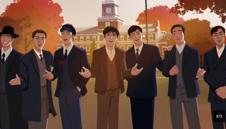 In the promotional video for BTS's new album Arirang, seven Korean male characters reminiscent of BTS are shown singing in a setting depicting the campus of Howard University in the United States. Official BTS YouTube channel.