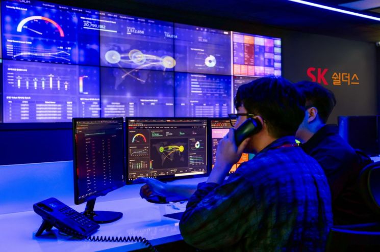 An SK Shieldus employee is monitoring at Secudium, the cybersecurity operation center. SK Shieldus