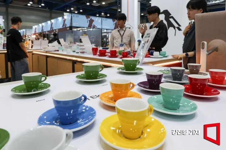 On April 15, various colorful espresso cups and coffee cups are on display at the "2026 Seoul Coffee Expo" held at COEX in Gangnam-gu, Seoul.